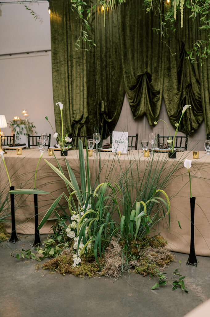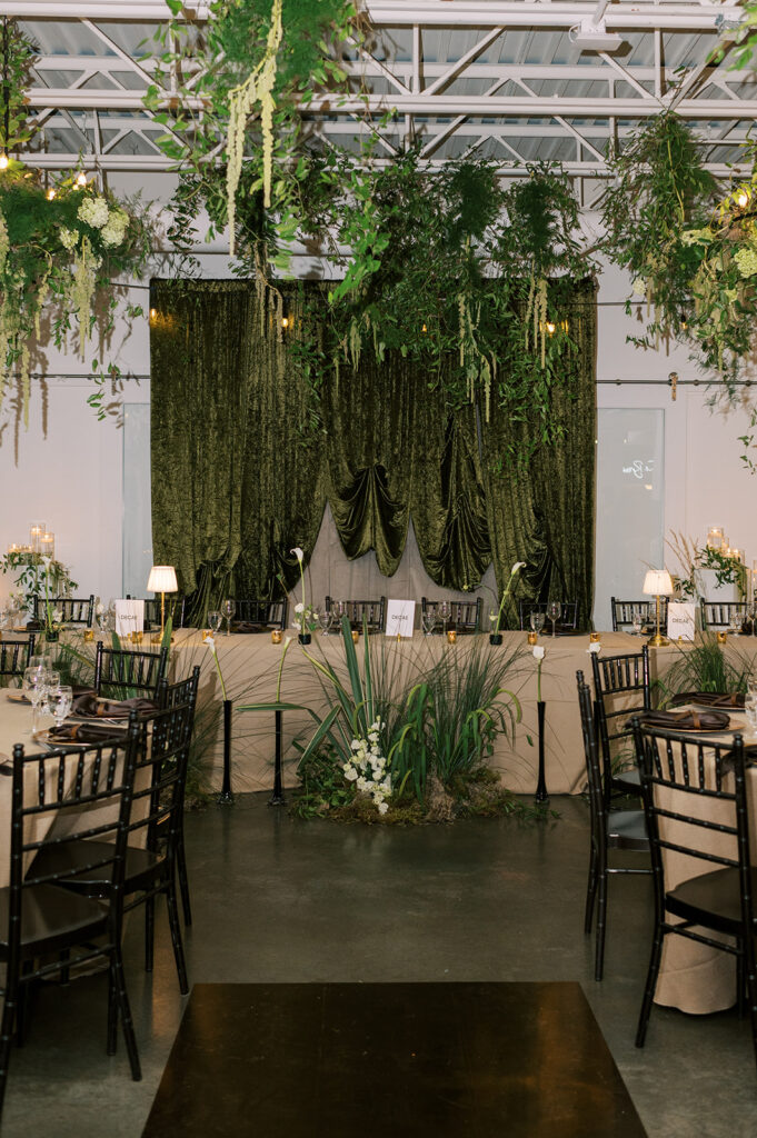 For Erin and Brandon, their wedding was an extension of home. Known for their record lounge, the couple wanted to recreate that cozy, speakeasy atmosphere. Their reception featured a custom cocktail menu inspired by their favourite bar experiences and a menu that felt like dining in their own living room. Shades of green filled the space,a heartfelt tribute to Erin’s grandmother, a botanist, with flowers cascading from the ceiling in a breathtaking nod to her legacy. It was intimate, soulful, and beautifully personal.